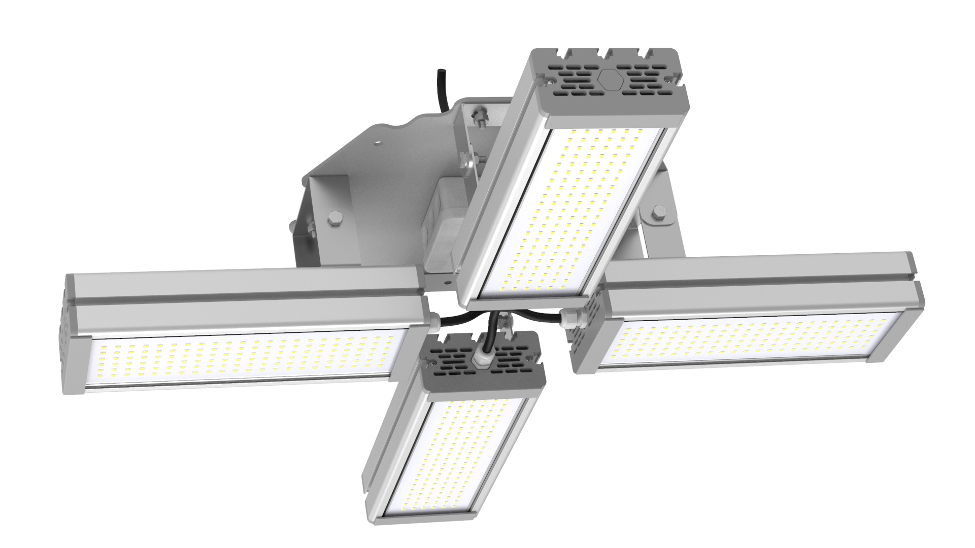 Подвесные промышленные светильники класса High-Bay с креплением на трос в 1 точке. Защита от 380В. Каждая секция имеет регулировку наклона.