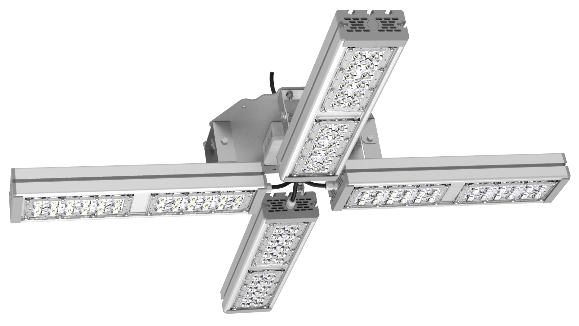 Подвесные промышленные светильники класса High-Bay с креплением на трос в 1 точке. Защита от 380В. Каждая секция имеет регулировку наклона.